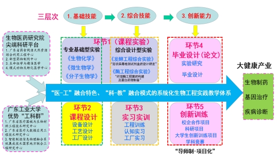 图1 产业导向、“医工-科教”双融合、五环节、三层次系统化的生物工程专业实践教学体系