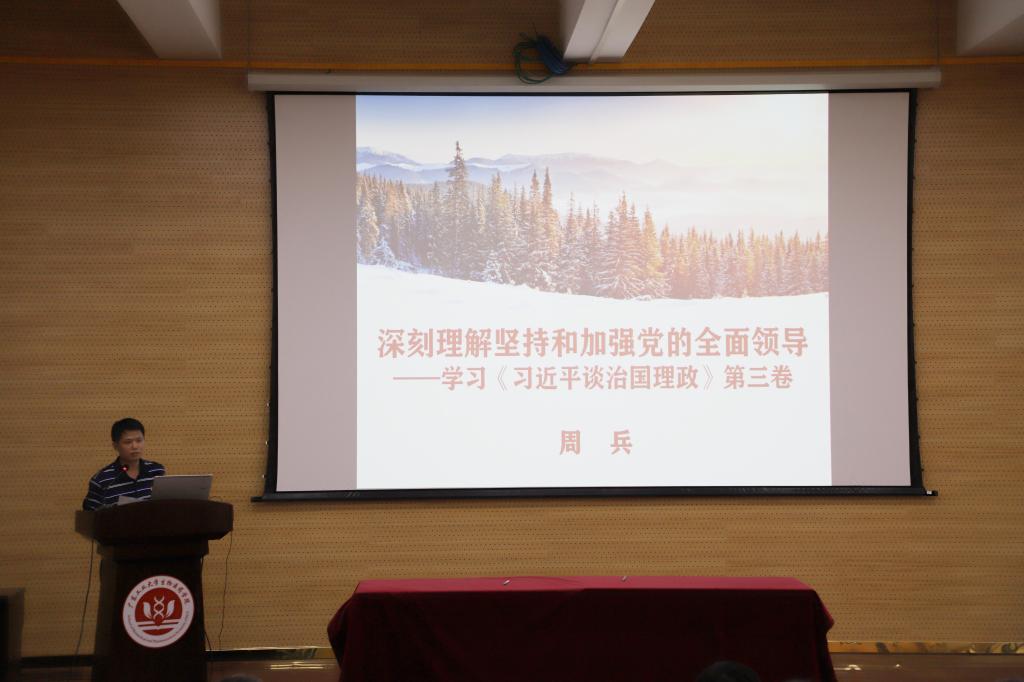 签约仪式后,两支部联合邀请马克思主义学院原理教研室主任周兵副教授为到会党员作专题理论学习辅导。周兵以“深刻理解坚持与加强党的全面领导—《习近平谈治国理政》第三卷”为题,对《习近平谈治国理政》第三卷学习内容进行了系统梳理分析,重点阐述了如何深刻理解坚持和加强党的全面领导,并通过讲解习近平总书记的知青岁月引导大家感受领袖魅力,为全体党员上了一堂生动、精彩、实用的专题党课,有效的提升广大党员的政治站位,强化了使命担当。