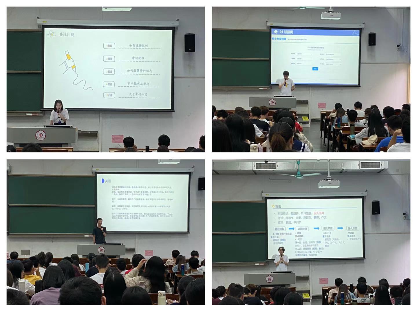 第二次年级大会以“考研之学习习惯、心态的准备”为主题,邀请本科17级考研成功的梁敏婷、肖焕欣、黄艺斌、黄冬超和吴小语为同学们分享考研宝贵经验,师兄师姐们分别从实验室经历准备、自主和自律学习的重要性、考研目标院校选择、考试流程等方面分享了自己的经验,为同学们分析了考研形势、普及了考研知识、解读了报考政策,增强同学们备战考研的坚定决心。