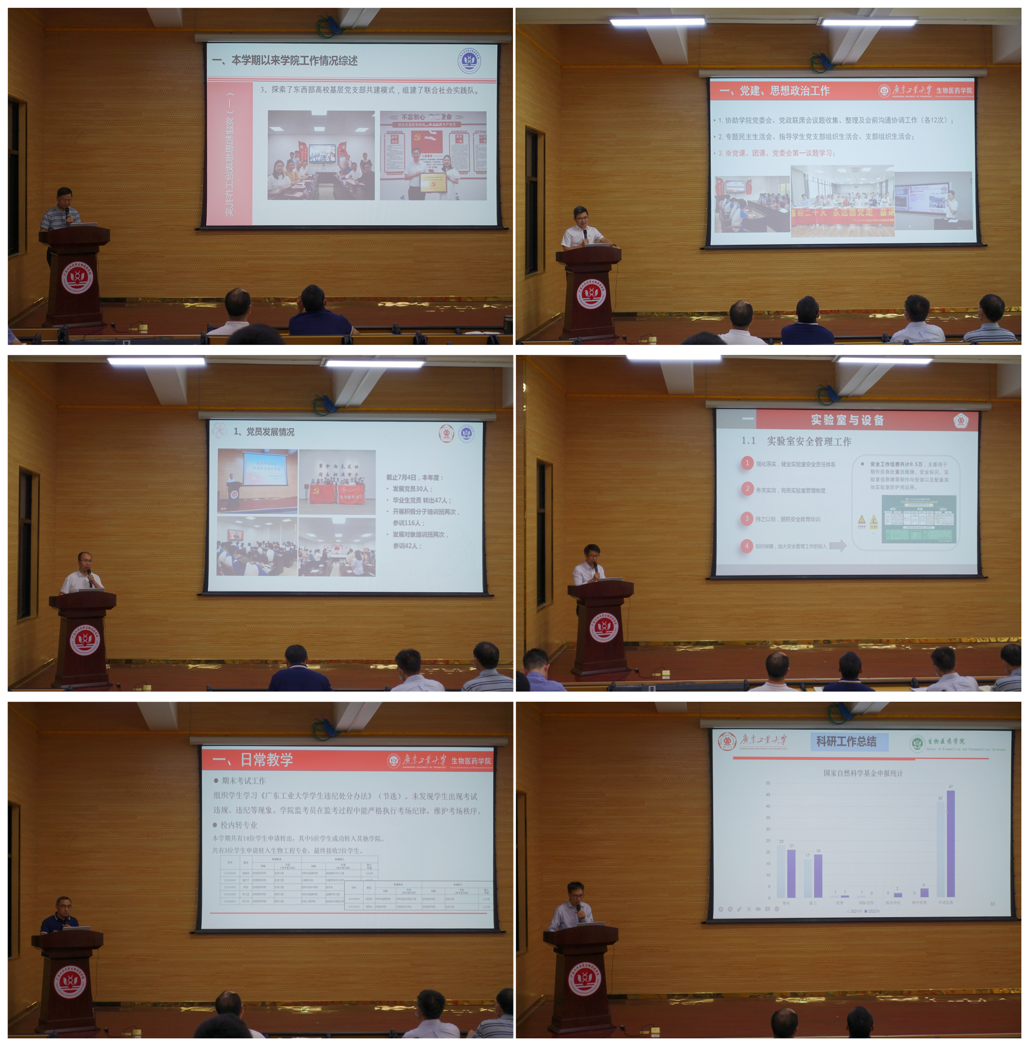 黄名正总结党建、思想政治、实验室管理等工作情况。本学期学院党委理论学习中心组学习、党委会第一议题、各党支部组织生活等党建思想政治工作正常开展,学院学生第二党支部与贵州理工学院食品药品制造工程学院学生党支部开展共建工作,通过党建共建汇聚发展合力,在共建中突出行动引领,在发挥党员先锋模范作用方面起到引领作用。实验室安全、科研用房调整等工作也取得初步成效。