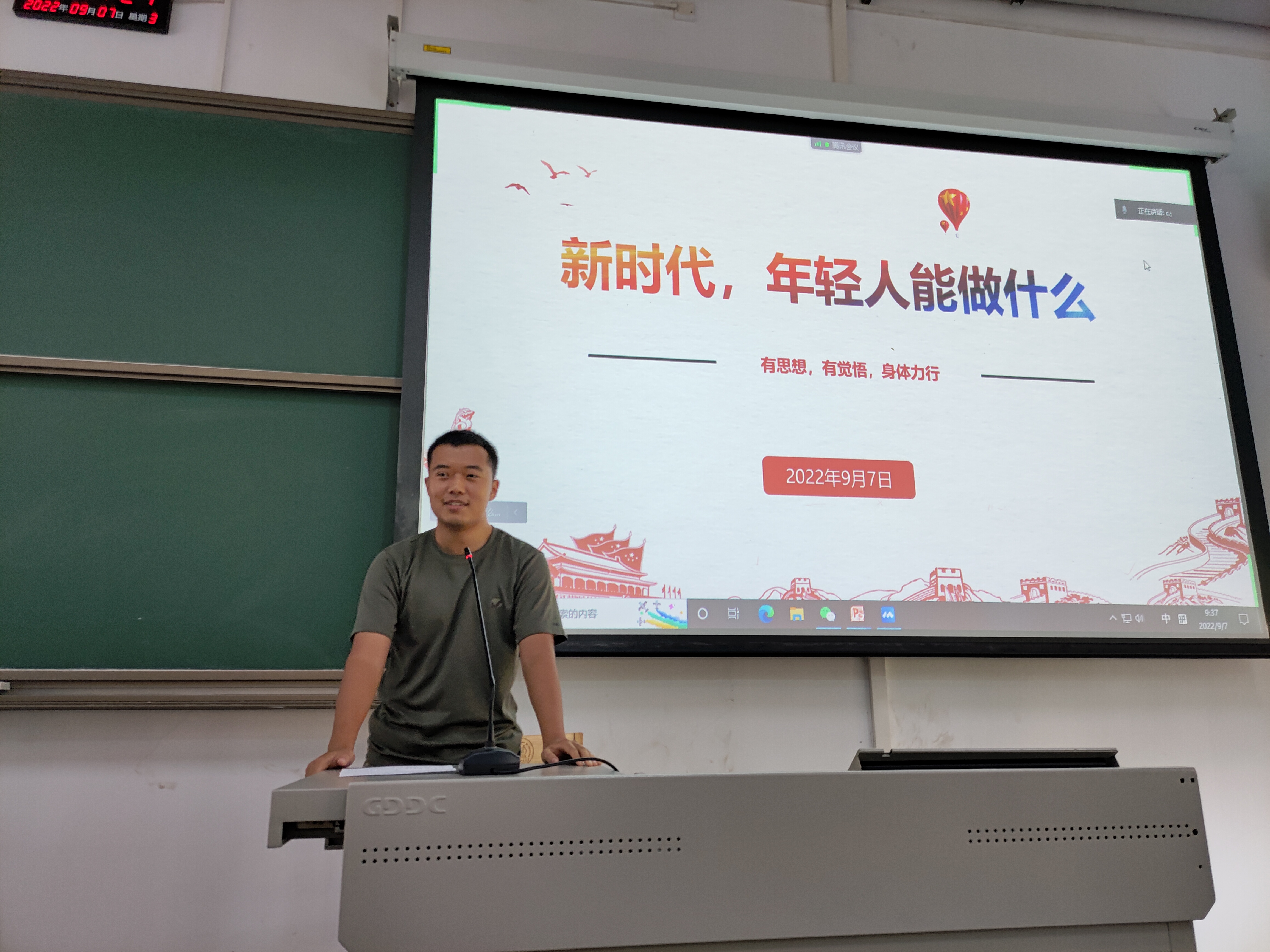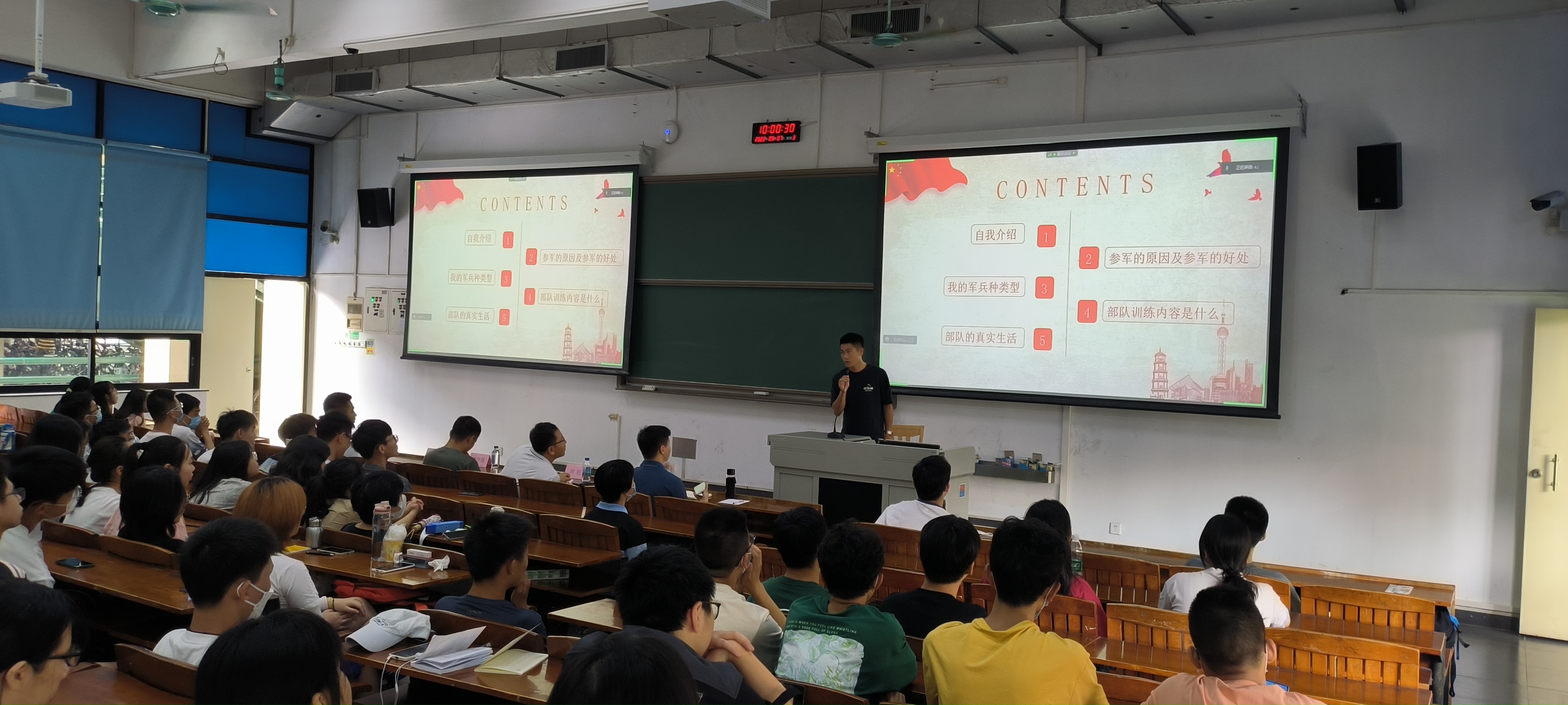 陈彦机从“新时代年轻人能做什么”的角度讲述自己的参军报国情怀,鼓励新生们在未来踊跃参军,在守护国家的路上成长为有理想有抱负的国家栋梁;何宏煜向新生们分享自己在成长为一名有灵魂、有本事、有血性、有品德的四有优秀士兵的心路历程,让新生们认识到成为一名好兵需要付出什么;郭泽镇为新生们介绍军兵种类型,展示部队生活照片,让新生们更真实地体验军营的酸甜苦辣,寄语新生们要勇于做难事,从难事中有所得,在难事中挑战自己。