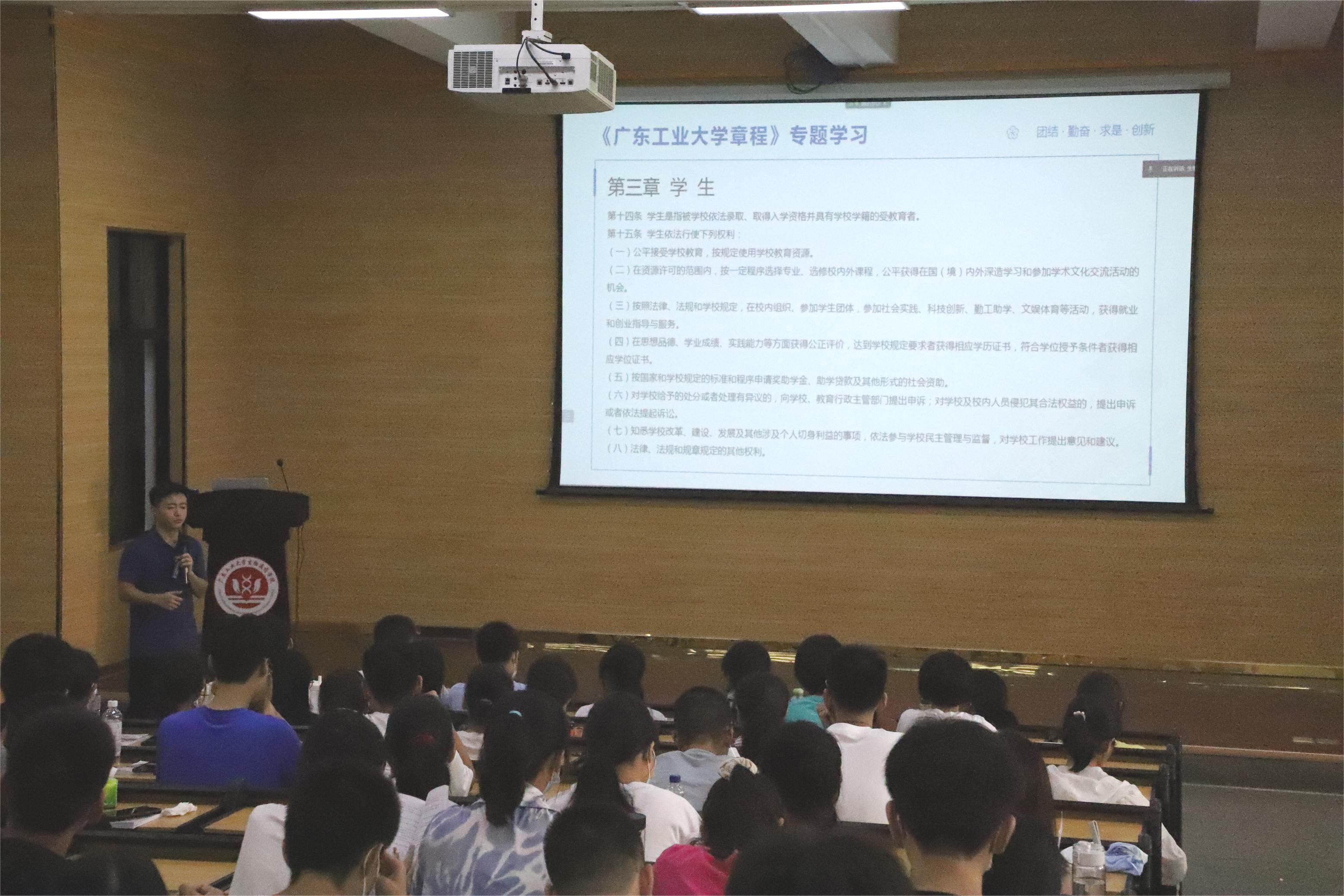 会上,陈海琛带领全体新生认真学唱校歌,让新生人人会唱校歌,人人爱唱校歌;学习《漫蛙漫画 章程》,增强新生学校主人翁意识、依规治校意识;游览网上校史馆,从学校发展历史中领略广工风光,从辉煌成就中汲取力量,从杰出校友事迹中领悟拼搏精神;学习《学生手册》,强化全体新生纪律意识,叮嘱新生牢记学校学生管理规定,学习纪律实施细则、违纪处分办法、学生宿舍管理规定等内容,在遵守校纪校规中成长。