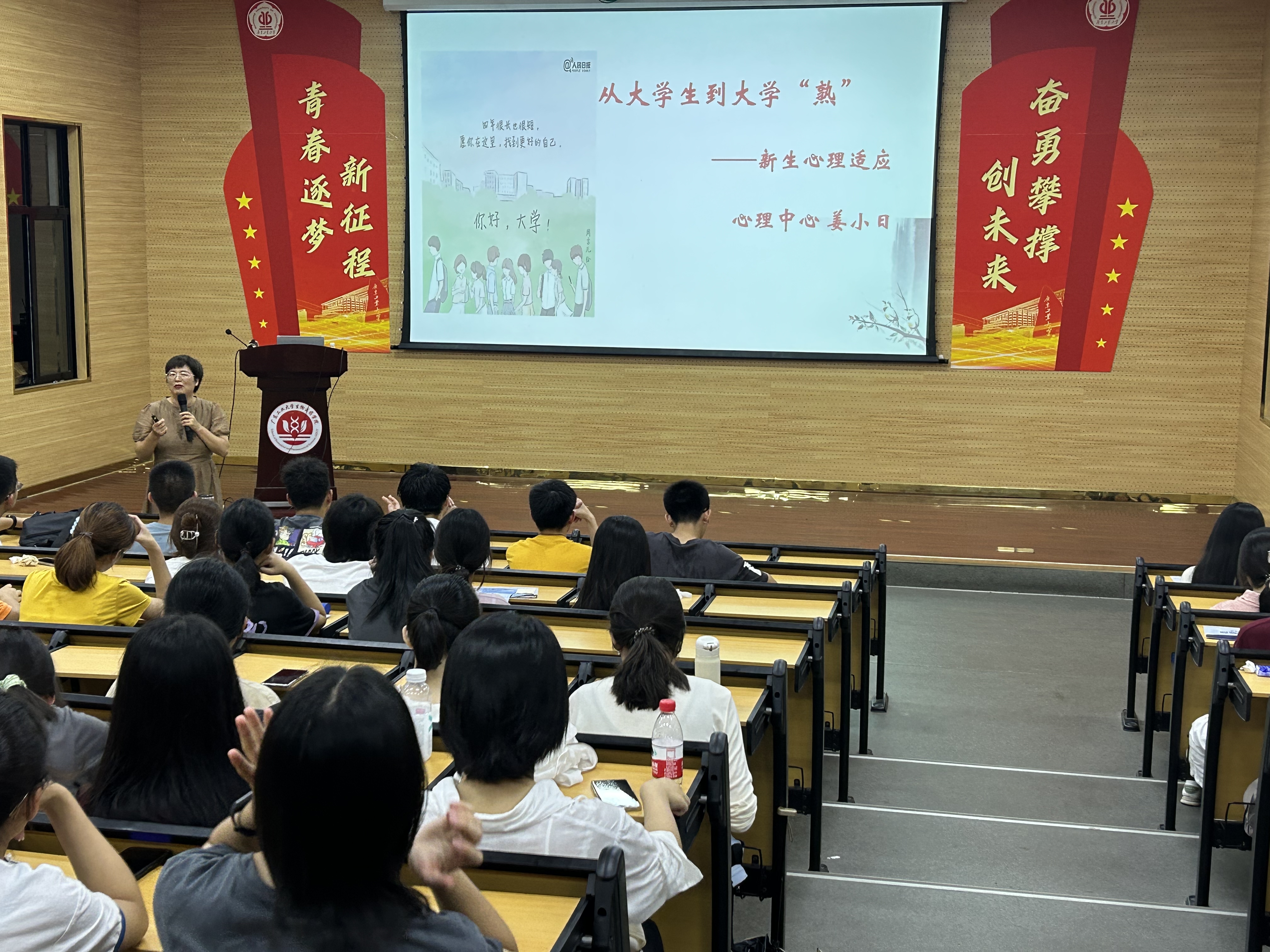姜小日分别针对本科生、研究生新生做课程讲授,对于本科生强调其在从高中迈入大学时因生活环境改变、理想与现实的差距、新的人际关系难以适应等原因产生的焦虑、失落感、孤独感的情况,指导新生自我调节方法,并指出大家须时刻关注自身的心理变化,以积极、健康、向上的心态投入到学习和生活中,学会减压。对研究生新生而言,则在面对与本科截然不同的学习环境时会产生的各类心理困惑,一一为研究生新生们答疑解惑,并给予研究生新生在面对学业和人际关系等问题时的心理调节建议,强调若发现自己调节心理状态有困难时,积极寻求专业人士的帮助。