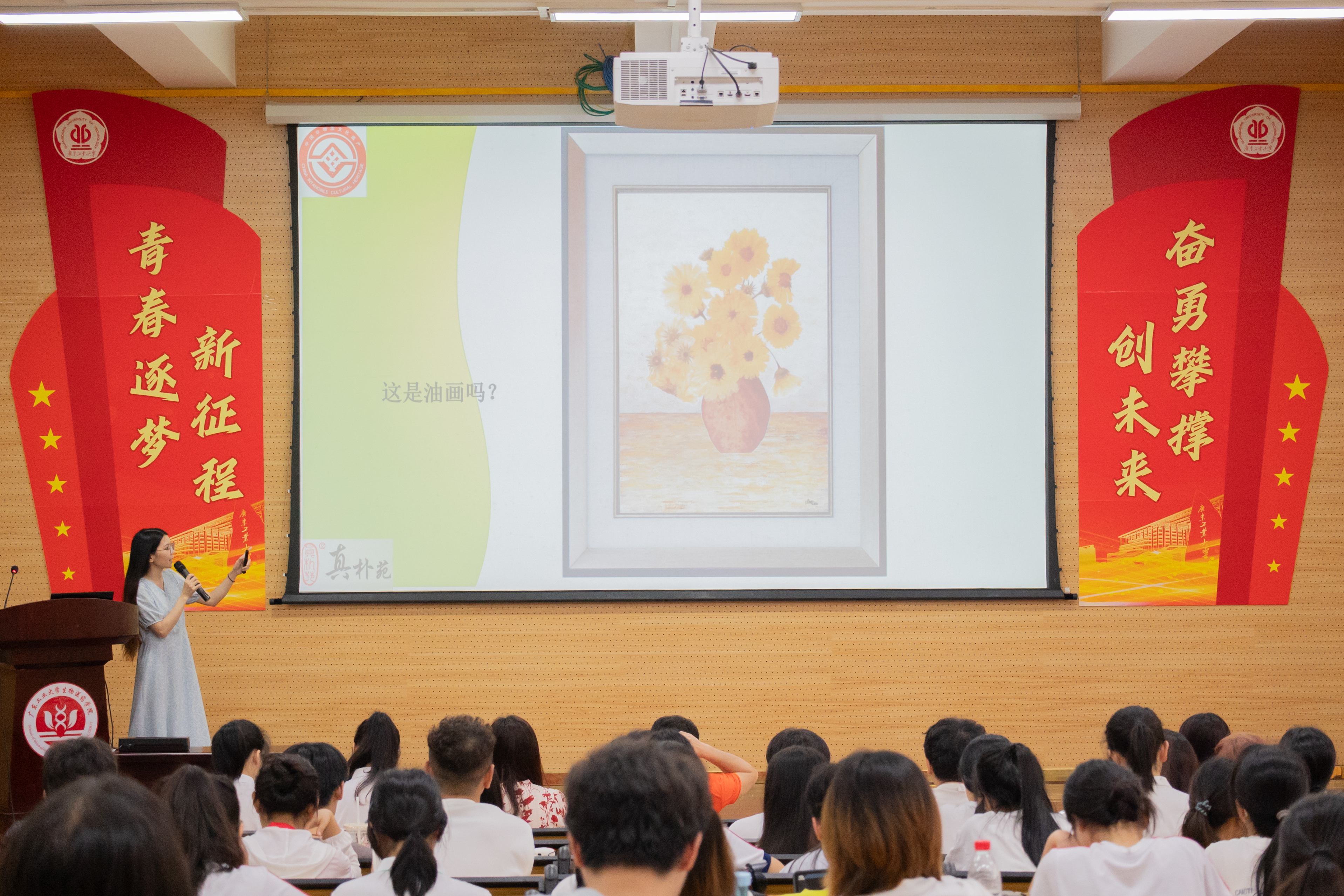 “当窗理云鬓,对镜贴花黄。”李丽坚引用《木兰辞》中的经典诗句,向同学们普及花的历史,以及广州这座花城城市如何与花结缘,由点到面,通过一幅幅优美的押花作品向学生介绍押花艺术。她提到,押花技艺历久弥新,在当前已经被赋予了新的时代内涵,有着丰富的价值。在实践环节,同学们专心致志地制作自己的作品,爱绿护绿,小心翼翼地将绿叶与鲜花定格在此刻,感受绿美,并在完成后满心欢喜进行分享。