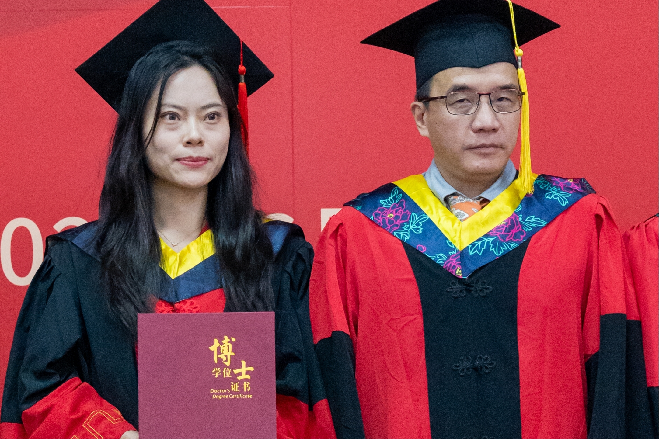 学院学位评议组委员叶金星教授宣读学校关于准予毕业、授予学位文件,伴随着欢快的进行曲和热烈的掌声,学院学位评议组林章凛教授、叶金星教授、赵肃清教授、张宏梅教授和赵昱教授为本、硕、博毕业生拨穗,授予学位,颁发学位证书并合影留念。