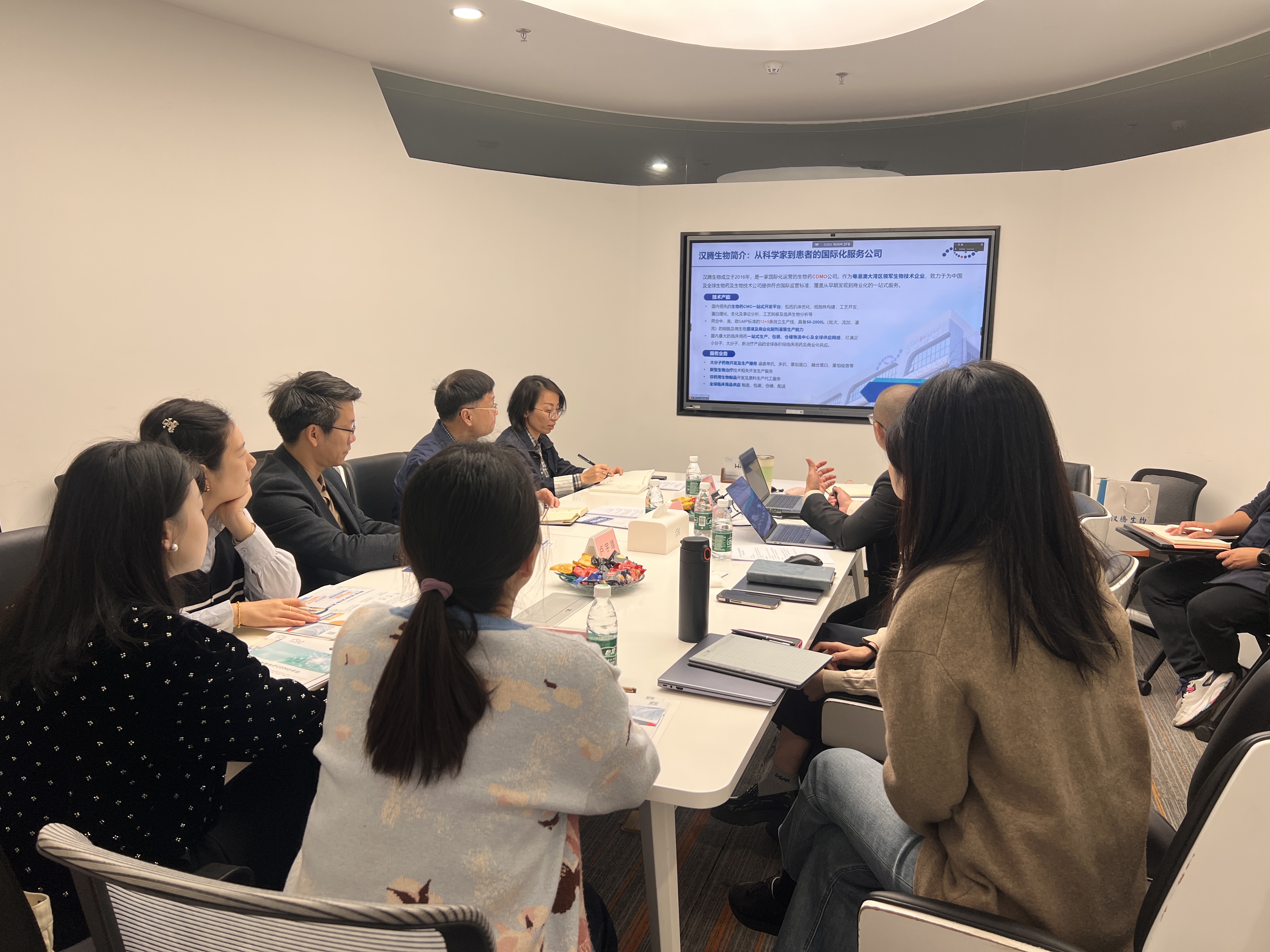 在广州市汉腾生物科技有限公司,公司生产基地负责人韦庆焜带领大家一同参观了公司展厅,并向来访人员介绍了公司的发展历程、核心技术、产品布局和未来规划。徐向东介绍了学院的基本情况,卢宇靖和学院老师们分别介绍了学科特色、人才培养、毕业生总体情况等。该公司作为漫蛙漫画 研究生联合培养基地,就未来进一步深化产学研合作、学生实习就业等方式进行了深入交流,为推动未来双方的合作做出进一步规划。在实验室参观环节,学院一行深入企业研发中心和生产一线,近距离观摩了先进的实验设备和技术流程。企业技术负责人详细讲解了相关产品的研发过程及技术创新点,让老师们对生物医药行业的前沿技术有了更直观的了解。
