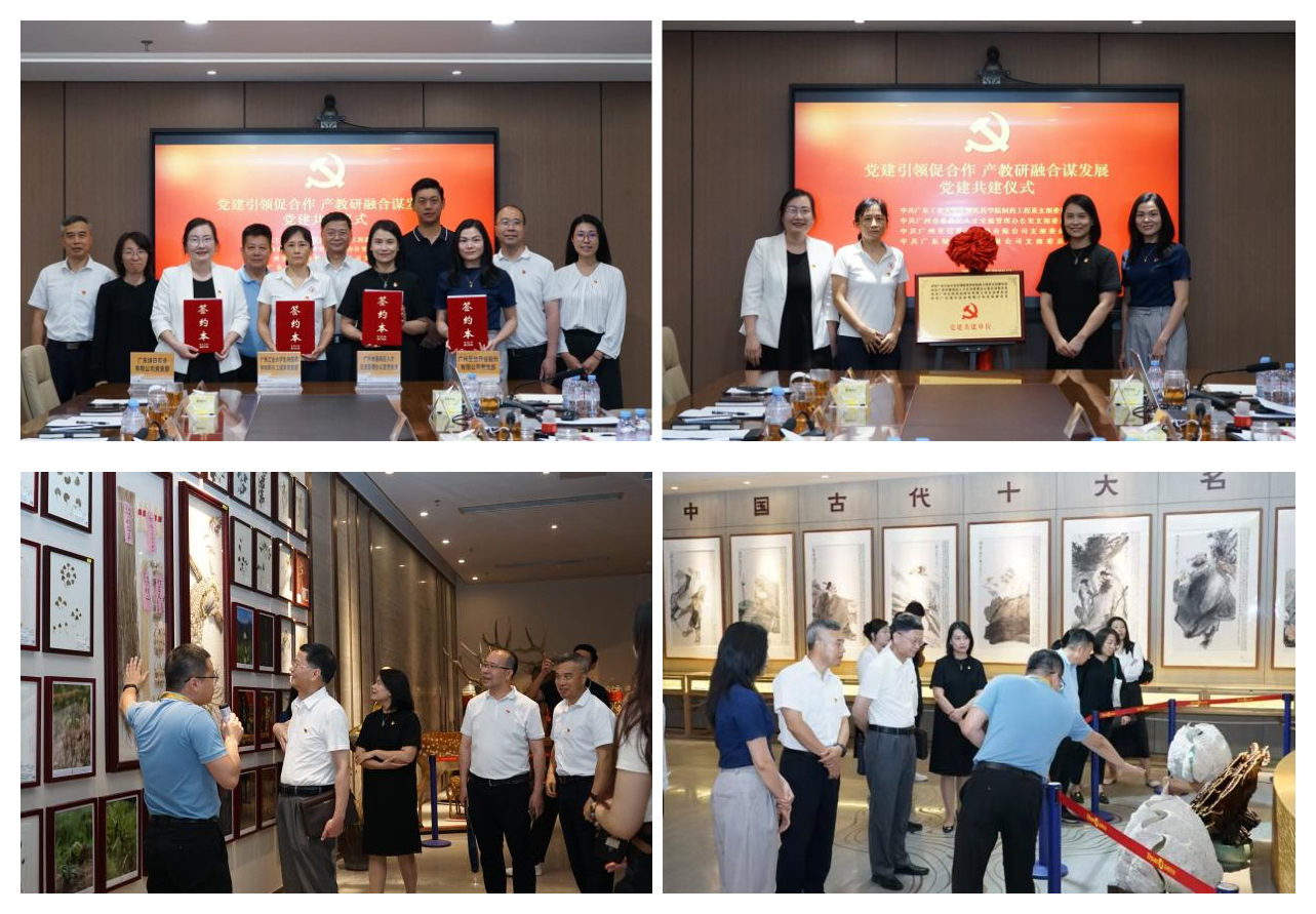 此次党建活动以“党建引领促合作,产教研融合谋发展”为主题,深入贯彻党的二十届三中全会精神,落实“教育、科技、人才”三位一体战略,创新探索校政企协同育人模式。通过搭建党建共建平台,各方将实现“资源整合—技术攻关—人才培养—产业服务”全链条联动,构建医药产教研融合新生态,为番禺区高质量发展提供人才支撑与创新动力。在至信药业副总经理陈志维的带领下,与会人员实地参观了该公司的科普基地标本博物馆、党建中心、质量管理中心等。座谈会上,各方代表围绕党建共建机制创新、人才协同培养、实习实训、产教研合作等核心议题展开深度交流,并就构建“教育—人才—产业”生态链的实践路径达成共识。大家一致认为,医药产业作为战略性新兴产业,对高素质人才的需求迫切。通过党建共建活动,校政企各方能够充分发挥优势,实现资源共享、优势互补,推动产教研合作项目的落地实施,为番禺区医药产业的高质量发展提供有力支撑。共建签约揭牌仪式上,各方代表共同签署了党建共建协议,并为共建单位揭牌,标志着四家单位的党建共建活动正式拉开帷幕,开启了校政企合作的新篇章。
