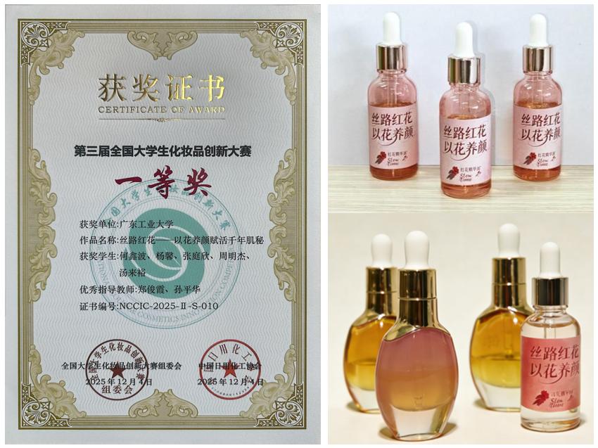 该获奖作品以新疆红花为核心原料,依托绿色高效提取工艺与创新配方体系,聚焦“美白—抗氧—修护”多维护肤需求,研发出一款多效合一的植物精华油。值得关注的是,项目深度联动广东与新疆高校科研资源,实现了东西部特色原料与技术优势的精准互补,既拓展了传统中药红花在化妆品中的应用,又响应了国家中医药传承创新与区域协同发展战略,为产学研融合赋能产业升级提供了实践范本。
