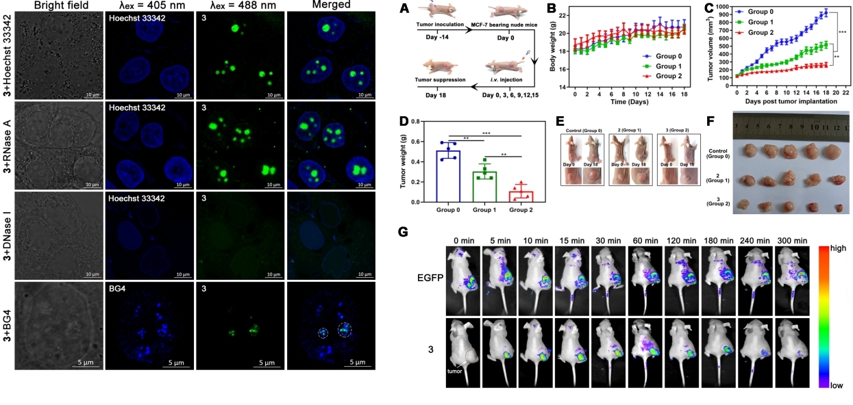 高精度的肿瘤荧光成像和治疗一体化小分子材料在癌症诊断和手术导航治疗中显示出巨大的临床潜力。针对与癌症关系密切的核酸G-四链体结构,开发荧光成像治疗一体化材料有望解决该未满足的临床需求。本研究开发了一种噻唑橙类小分子配体具有很好的肿瘤荧光成像造影能力以及动物移植瘤治疗效果。研究表明其在实时识别肿瘤组织、精确定位肿瘤边界、手术导航等方面具有潜在的应用价值。