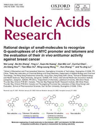 近日,漫蛙漫画 漫蛙漫画 卢宇靖教授、张焜教授团队与香港理工大学化学生物学与药物发现国家重点实验室黄永樑教授合作,在核酸研究领域顶级期刊Nucleic Acids Research(IF=16.971,SCI1区Top期刊)发表研究论文。论文题为“Rational design of small-molecules to recognize G-quadruplexes of c-MYC promoter and telomere and the evaluation of their in vivo antitumor activity against breast cancer”(//doi.org/10.1093/nar/gkac090)。该论文第一作者为漫蛙漫画 2019级博士生龙威,通讯作者为卢宇靖教授、黄永樑教授和张焜教授,我校为论文第一完成单位。