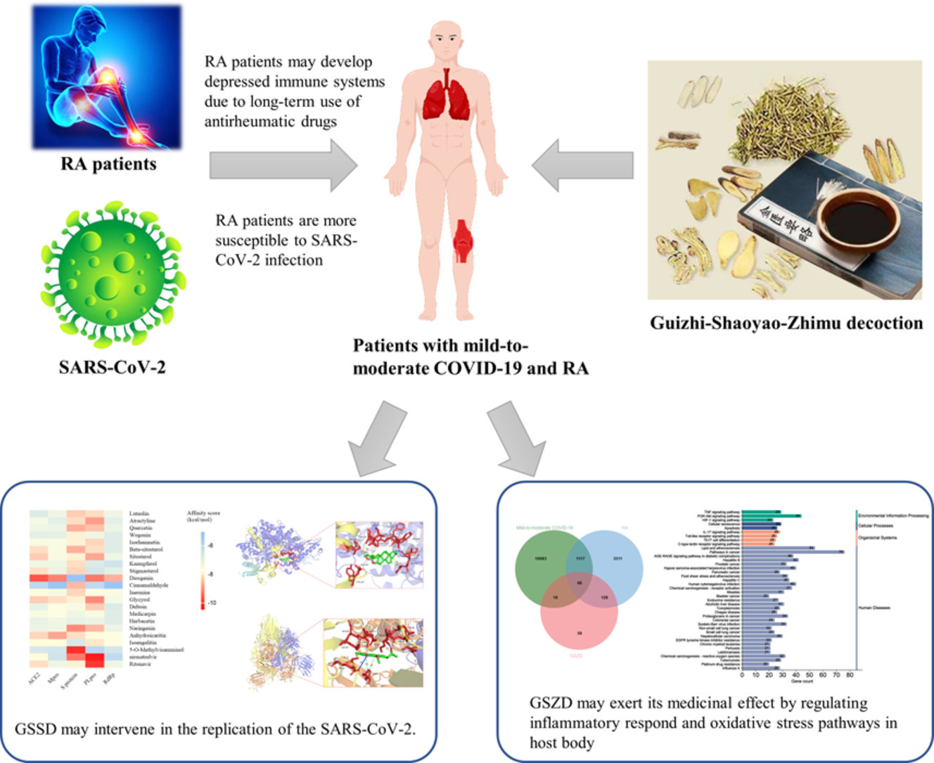 该研究聚焦长期服用免疫抑制药物治疗类风湿性关节炎(RA)的患者更容易感染COVID-19,并较高比例从轻中度感染转化为重度感染的临床现象。首次探索了轻中度COVID-19和RA的共同靶点和信号通路,并挖掘了来自《金匮要略》的传统名方“桂枝芍药知母汤”同时治疗轻中度COVID-19和控制RA的可能性和潜在机制:主要通过调节炎症相关途径和氧化应激来干预轻度至中度COVID-19和RA。这一发现为RA患者提供了针对轻中度COVID-19感染的治疗新选择。