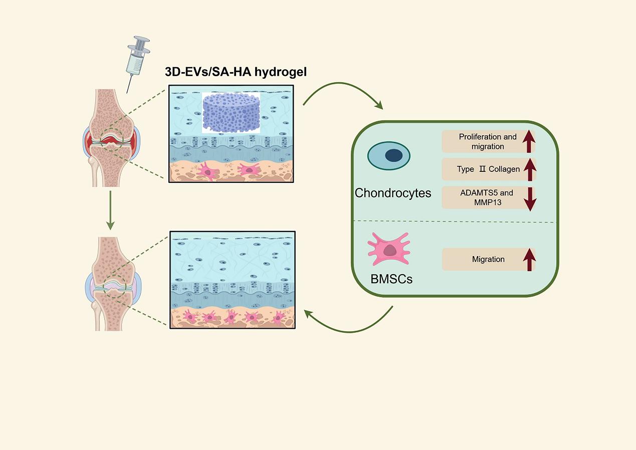 骨关节炎(OA)是全球最常见的退行性关节疾病,因软骨自我修复能力极弱,临床缺乏根治手段。研究团队针对传统二维培养间充质干细胞(MSC)外泌体产量低、活性不足等问题,创新性地开发了三维培养体系,显著提升了外泌体的产率及生物活性。基于此,团队进一步构建了海藻酸钠(SA)与透明质酸(HA)复合水凝胶载体,用于负载三维培养的MSC源外泌体。该研究将3D培养技术与生物材料支架结合,突破EVs规模化生产与靶向递送双重难题:三维培养系统模拟体内微环境,hPL替代胎牛血清(FBS)保障临床安全性;复合水凝胶可局部注射至关节腔,维持EVs长效释放,避免反复给药;3D-EVs通过上调II型胶原合成、下调炎症因子,实现软骨结构与功能双重修复。该成果为软骨再生医学提供了新型治疗策略,同时为干细胞外泌体的规模化生产与临床应用奠定了技术基础。袁正强教授团队长期致力于干细胞与生物纳米技术的交叉研究,其研发的工程化干细胞药物曾于2016年进入全球首个治疗肺癌的临床II期试验。此次突破标志着团队在外泌体递送系统领域取得又一重要进展。