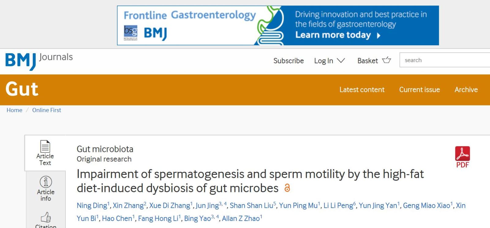 2020年1月2日,医学顶级期刊《Gut》,在线发表题为“Impairment of spermatogenesis and motility by the high-fat diet-induced dysbiosis of gut microbes”研究性论文(IF=18,医学1区)。论文第一作者为漫蛙漫画 漫蛙漫画 重大慢性疾病与创新药物研究所在读博士生丁宁,通讯作者为赵子建教授和李芳红教授。 在全球科研领域中,我们首次在高脂饮食诱导的肠道菌群失调和男性生育能力受损之间建立了功能性联系,并阐明了肠道菌群失调是导致精子产生和运动能力下降的主要原因之一。这提示了在未来的临床治疗中有望通过改善、优化肠道微生物的结构达到预防、辅助治疗或治疗部分男性不孕不育患者。该研究对我国相关科学研究也具有重要价值,将进一步推动和引领国际生殖系统代谢偶联的相关研究。
